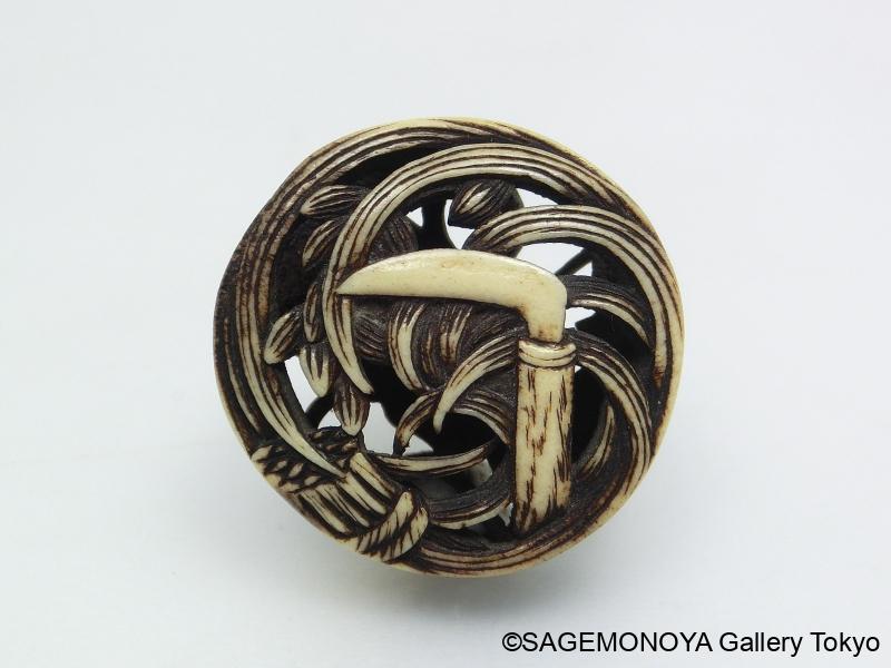 SAGEMONOYA > Netsuke > Manju, Ryusa, Kagamibuta, etc. > Ear of rice with a sickle, a scarecrow, and a straw raincoat.